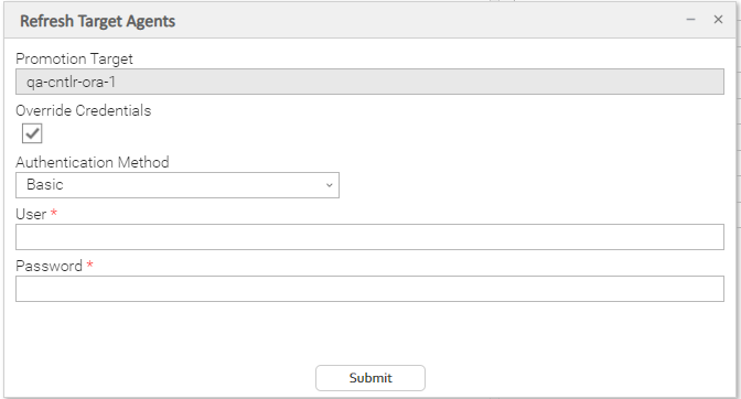 Click Submit. The Controller logs in to the target machine specified in the Promotion Target record URI field, accesses the appropriate tables, sorts the Agents into Agent types, and lists them in the appropriate <Agent-type> Mappings tab of the Promotion Target record.