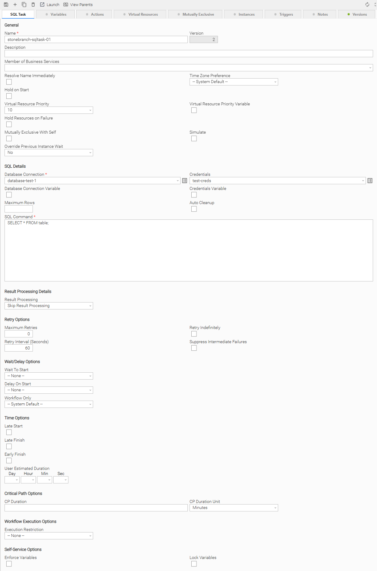 Auto Cleanup | When data is retrieved as the result of a SQL task, the data is written into a database table. If Auto Cleanup is enabled, the data is discarded upon the successful completion of the task (or workflow if the task is contained within a workflow). |