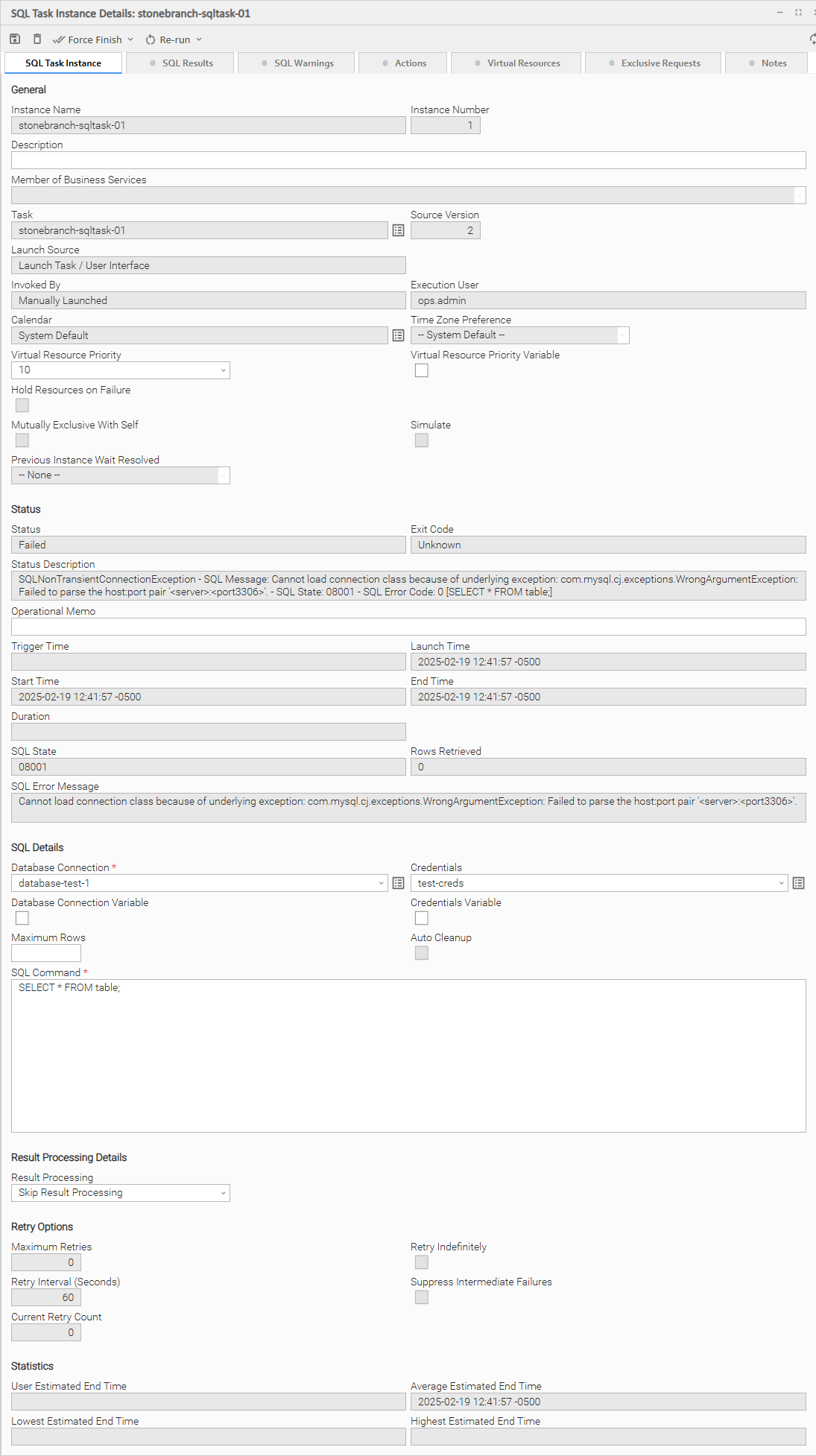 Next Retry Time | System-supplied for a task instance in the Failed status that is scheduled for automatic retry; Next time that a retry will be made. If a task instance is not scheduled for automatic retry, Next Retry Time does not display in the task instance Details. |