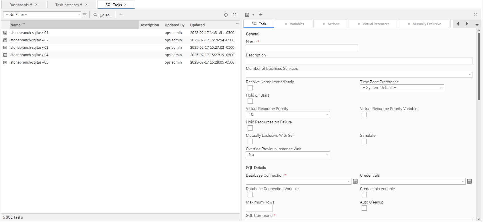 Step 1 | From the Automation Center navigation pane, select Tasks > SQL Tasks. The SQL Tasks list displays a list of all currently defined SQL tasks. To the right of list, SQL Task Details for a new SQL task displays. |