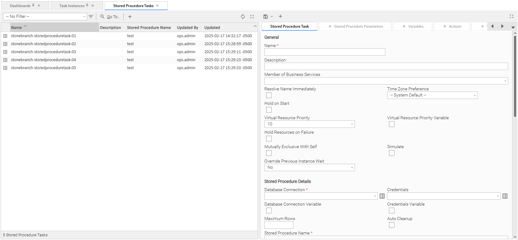 From the Automation Center navigation pane, select Tasks > Stored Procedure Tasks. The Stored Procedure Tasks list displays a list of all currently defined Stored Procedure tasks.