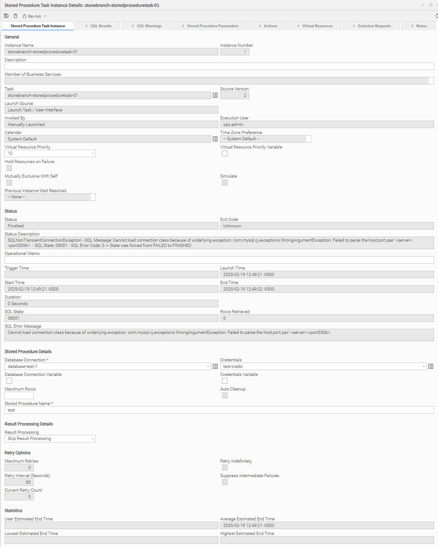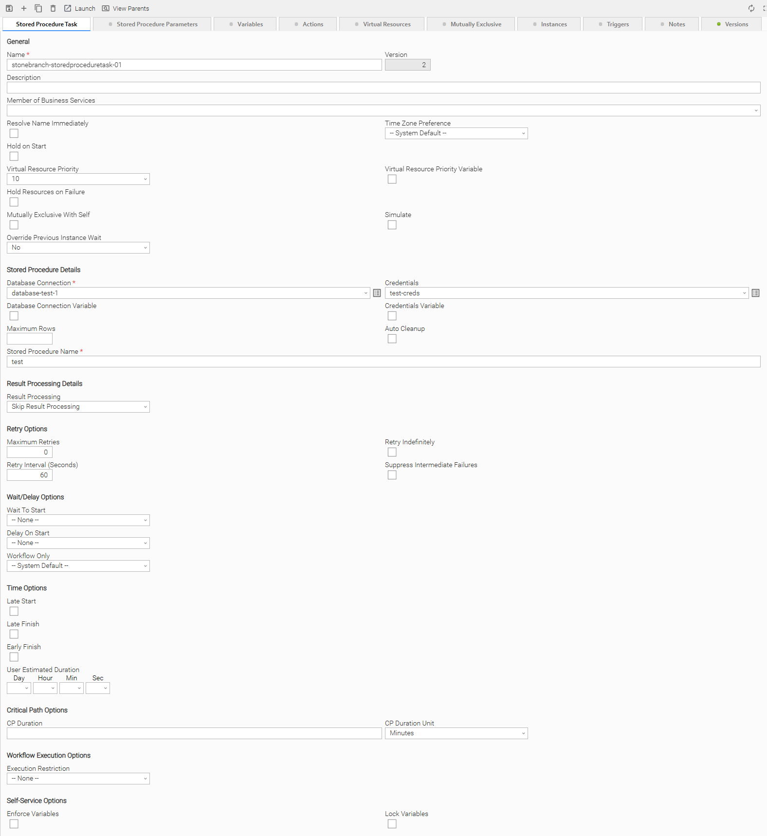 Depending on the values that you enter / select for these fields, and whether or not the Stored Procedure task has ever been launched, more (or less) fields may display. See the field descriptions, below, for a description of all fields that may display in the Stored Procedure Task Details.