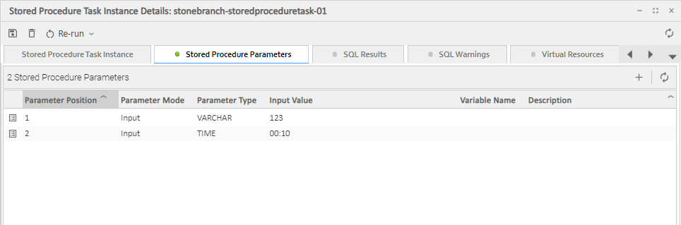 The following tables describe the fields, buttons, and tabs that display in the Stored Procedure Task Details.