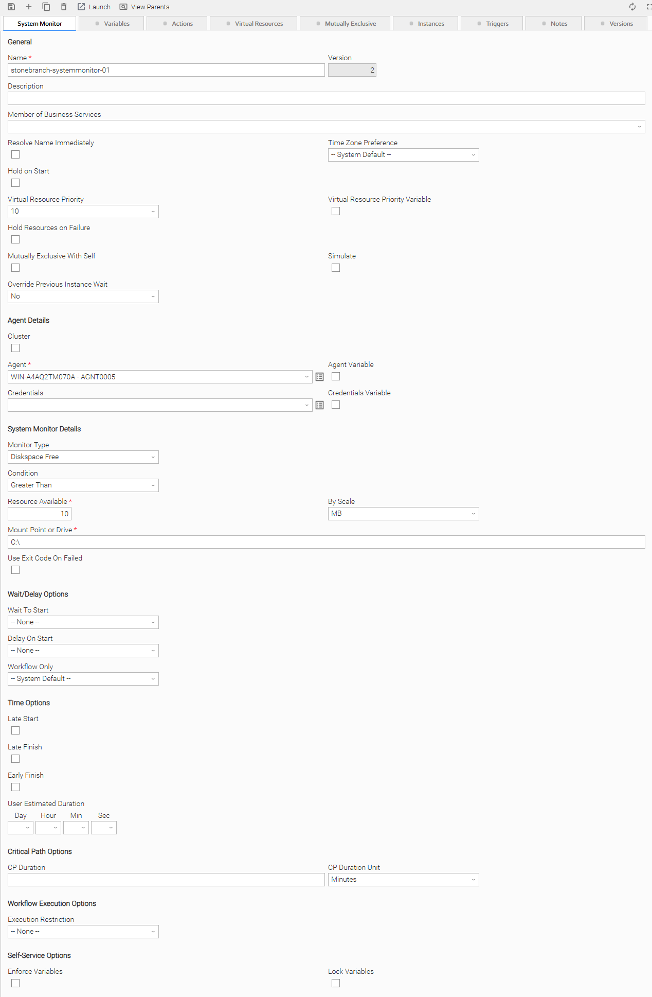 The System Monitor task allows you to monitor a specific remote machine and check for free disk space. You might use this task to check for sufficient disk space before running a task on it that requires a specific amount. In order for this task to execute, the remote machine must have Universal Agent running on it.