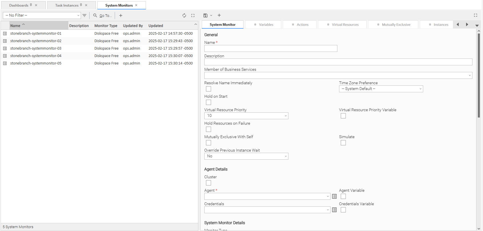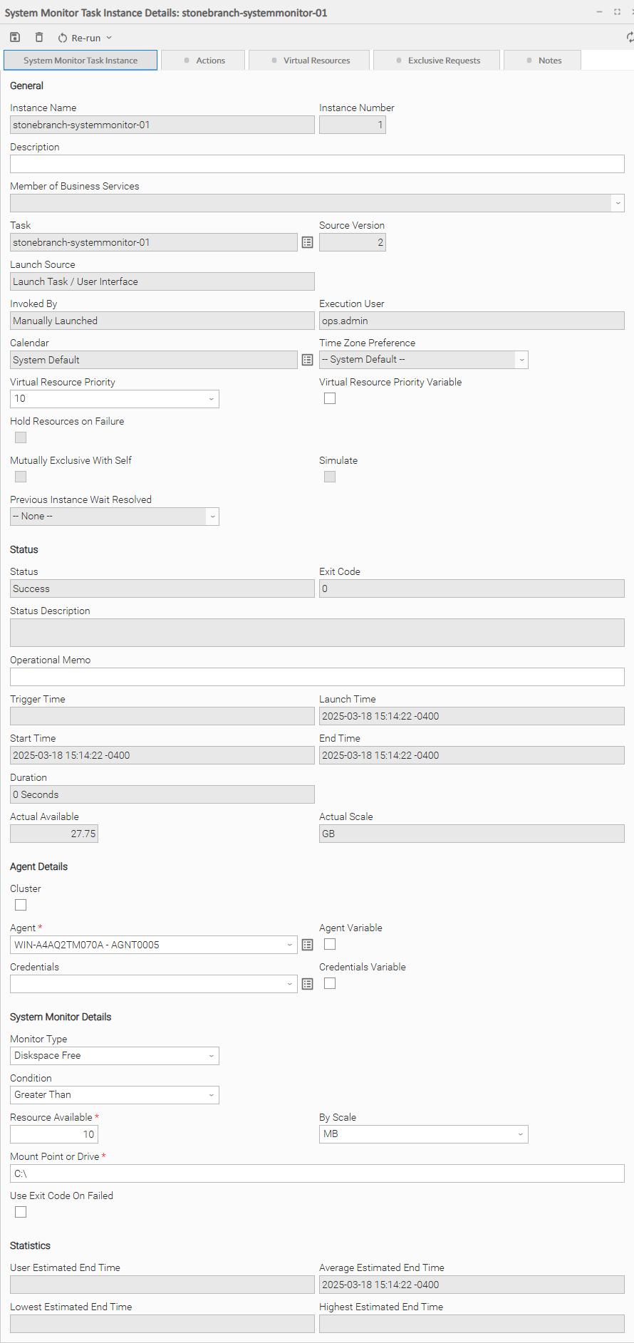 Depending on the values that you enter / select for these fields, and whether or not the System Monitor task has ever been launched, more (or less) fields may display. See the field descriptions, below, for a description of all fields that may display in the System Monitor Task Details.