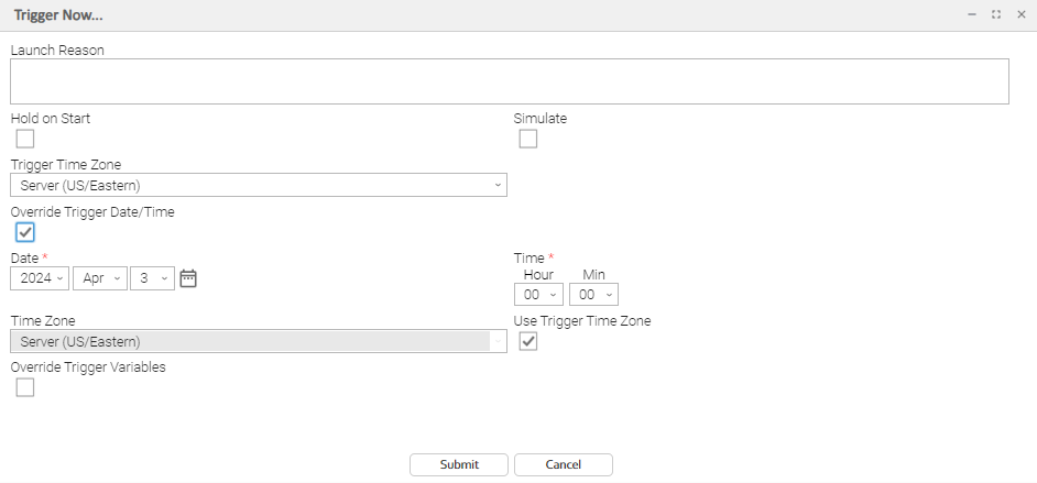 Step 6 | Select Override Trigger Date/Times to display fields in the Trigger Now... pop-up dialog that allow you to select a Date, Time, and Time Zone for this execution of the trigger.