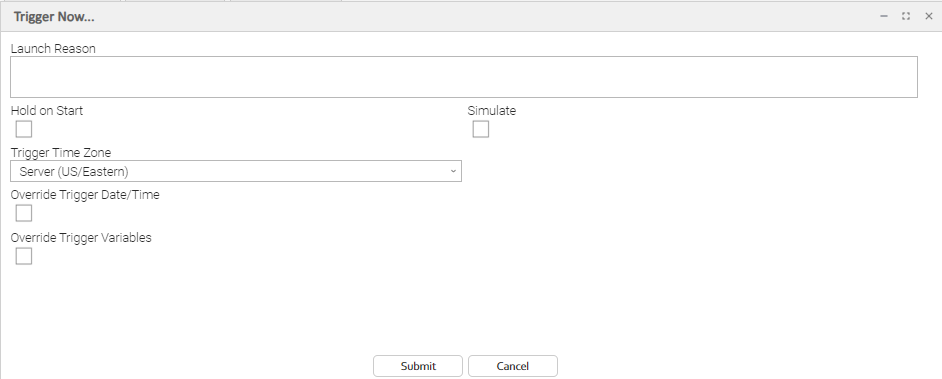 Step 7 | If the Trigger Time Zone field displays in the pop-up, the Time Zone field, by default, is read-only and displays the time zone in the Trigger Time Zone field, since the Use Trigger Time Zone field is checked. If you want the trigger to run in a different time zone for the selected Date and Time, un-check the Use Trigger Time Zone field and select a time zone from the Time Zone drop-down list. The Trigger Time Zone and Time Zone fields allow the trigger to run as if in one time zone, and also allow the Date and Time of the trigger to be based upon another time zone. For example, you could execute Trigger Now... to run at a specific date and time with respect to the Time Zone, and yet the trigger itself will run based upon the Trigger Time Zone. If the task is a Workflow, Trigger Time Zone lets you select a time zone for this specific launch of the Workflow so that it runs, and evaluates both Run Criteria and Execution Restrictions, according to that time zone. info You can select Override Trigger Variables if you want to launch the tasks specified in the trigger while supplying values for variables used by the tasks (see Triggering with Variables). You can also enable simulation mode from the Trigger Now... command, but you cannot disable it if it is already enabled in the Trigger Details. |