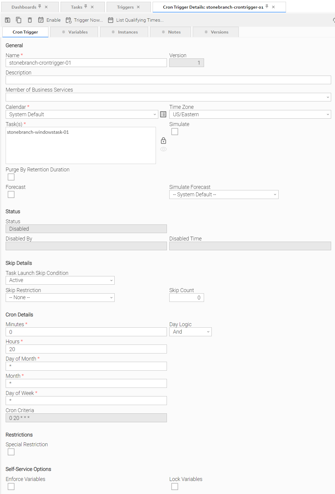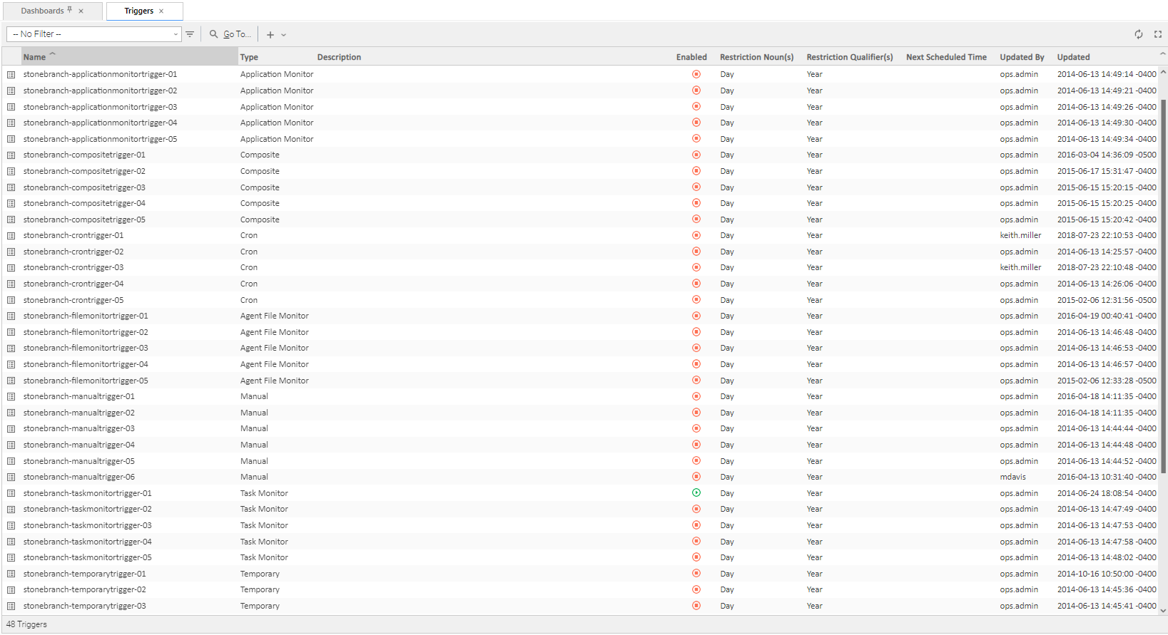 Enabled | User-defined; indication of whether the trigger is enabled (checked) or disabled (not checked). The user enables and disables the trigger by clicking the Enable Trigger / Disable Trigger buttons. Only enabled triggers are processed by the Controller. info If the Confirm Enable/Disable Trigger Command Universal Controller system property is set to yes, a confirmation pop-up displays if a user selects to enable or disable a trigger. |