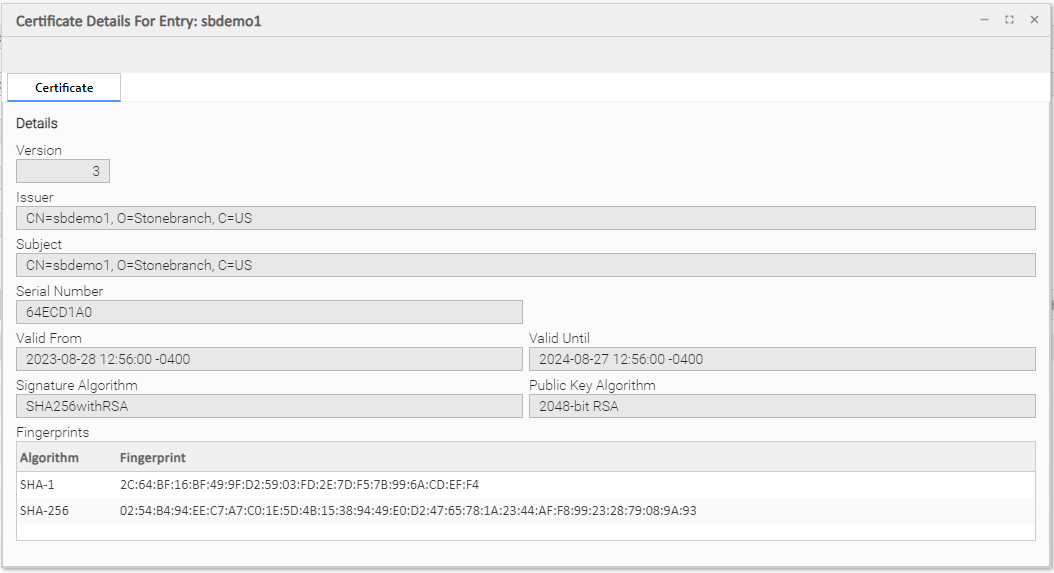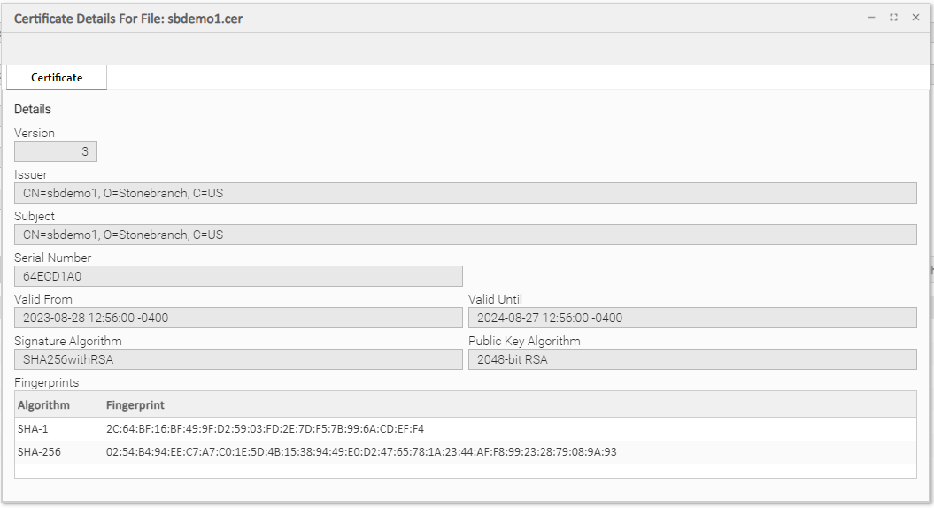 Fingerprints | The SHA-1 and SHA-256 certificate fingerprints. |