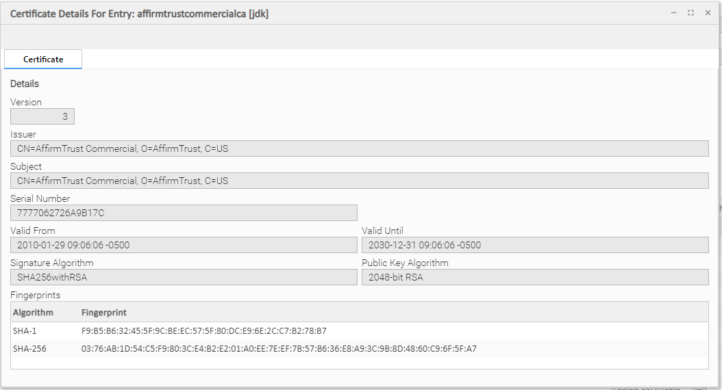Viewing Certificate Details for a Trusted Certificate Entry
