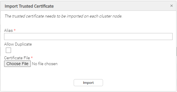 Step 2 | Click the Import Trusted Certificate... button at the top of the page. The Import Trusted Certificate pop-up dialog displays.