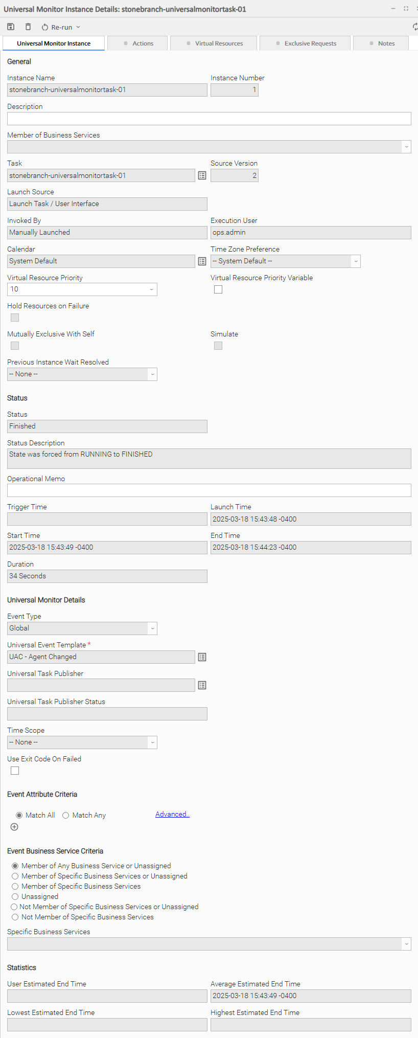 The following Universal Monitor Task Instance Details contains information on the execution of the task shown in the Universal Monitor Task Details.