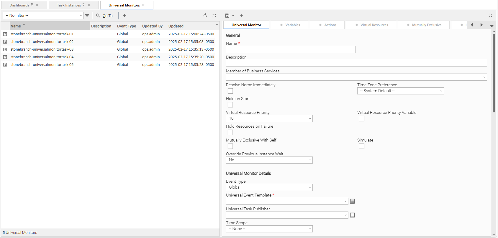 Step 1 | From the Automation Center navigation pane, select Universal Monitors. The Universal Monitor Tasks list displays a list of all currently defined Universal Monitor tasks. To the right of the list, Universal Monitor Task Details for a new Universal Monitor task displays.