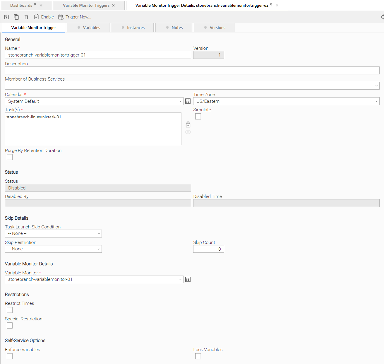 The following Variable Monitor Trigger Details is for an existing Variable Monitor trigger. See the field descriptions, below, for a description of the fields that display in the Variable Monitor Trigger Details.