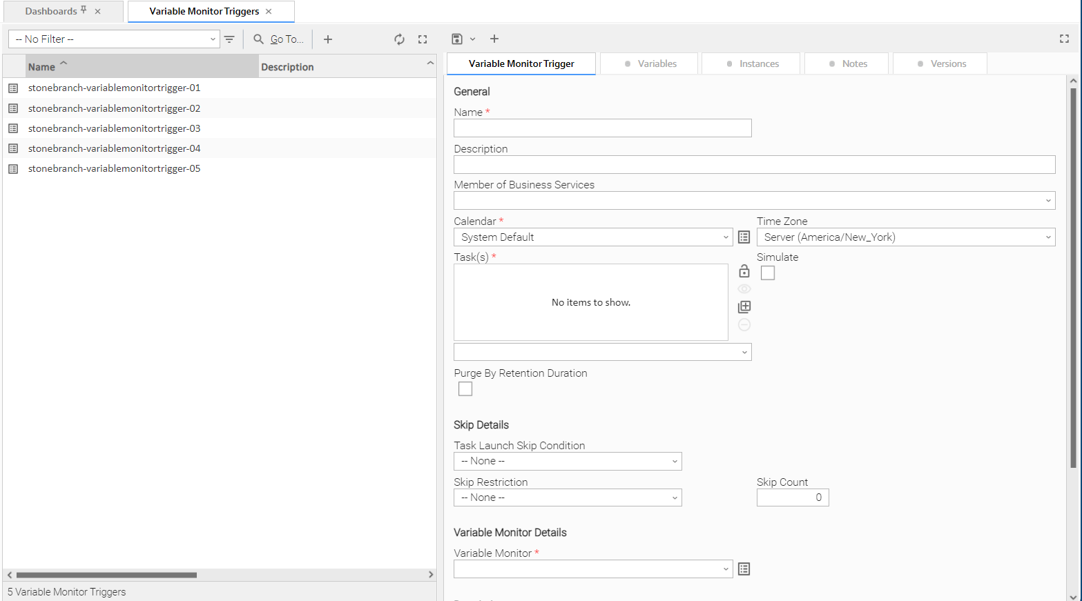 Before you can use a Variable Monitor Trigger, you need a Variable Monitor task, which defines the conditions for the variable being monitored.