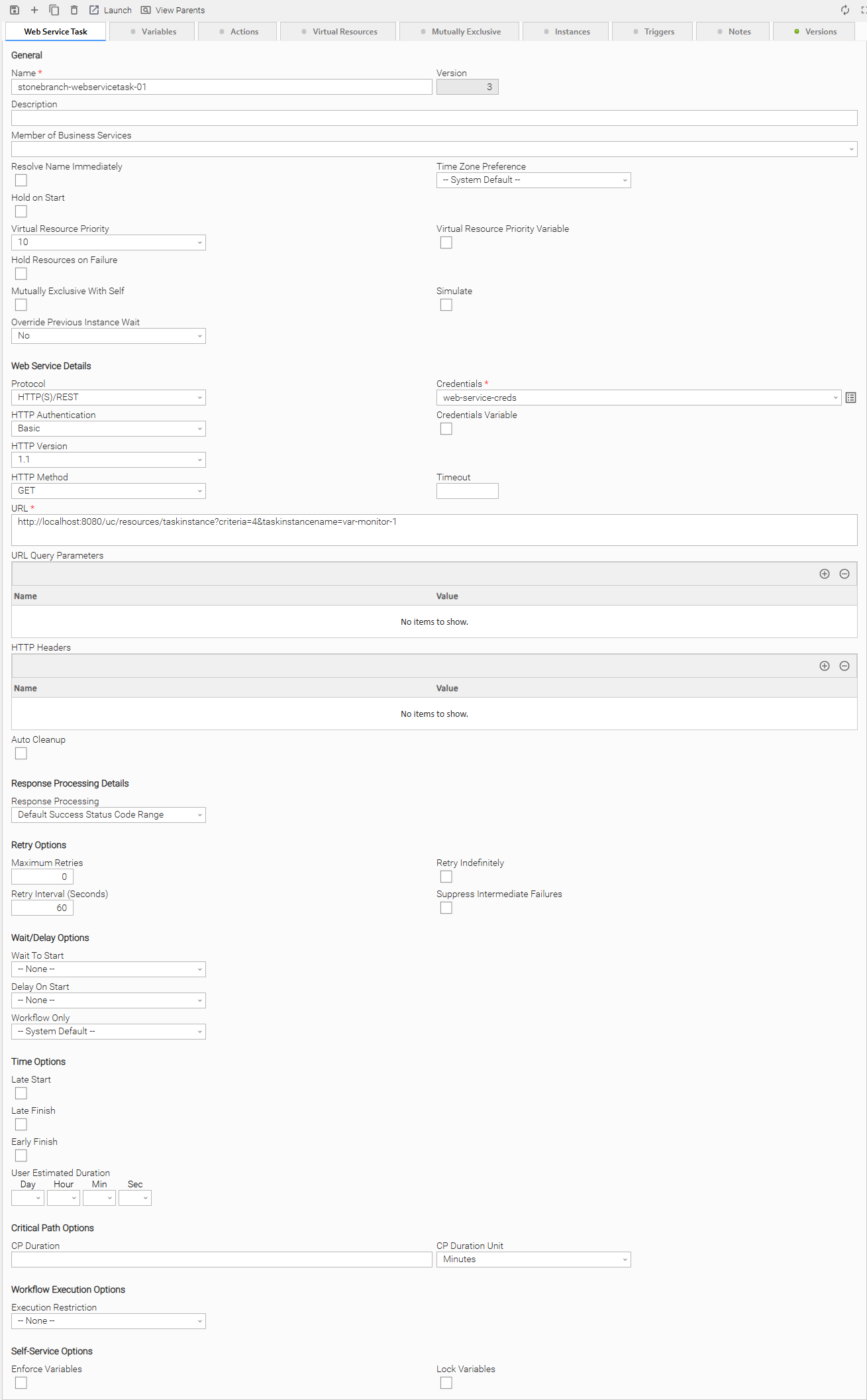 Depending on the values that you enter / select for these fields, and whether or not the Web Service task has ever been launched, more (or less) fields may display. See the field descriptions, below, for a description of all fields that may display in the Web Service Task Details.