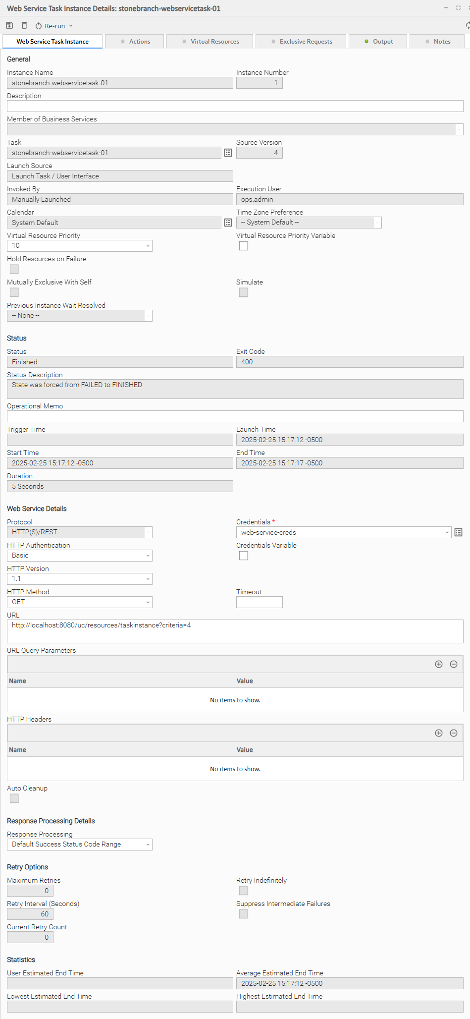The following Web Service Task Instance Details contains information on the execution of the task shown in the Web Service Task Details.