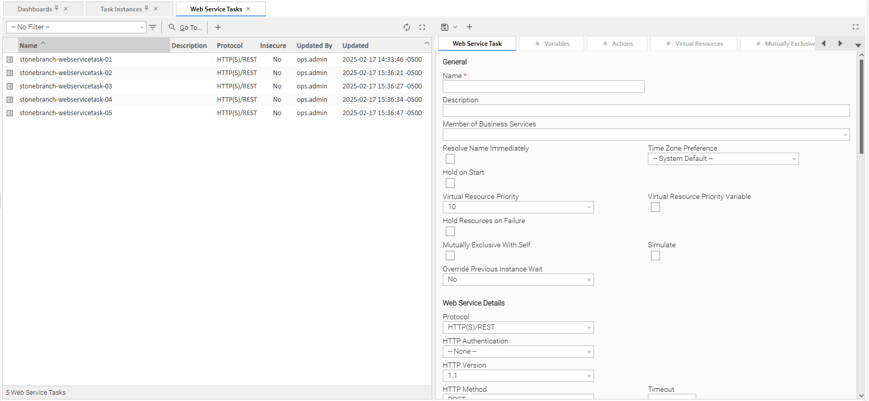 Step 1 | From the Automation Center navigation pane, select Tasks > Web Service Tasks. The Web Service Tasks list displays a list of all currently defined Web Service tasks. To the right of the list, Web Service Task Details for a new Web Service task displays.