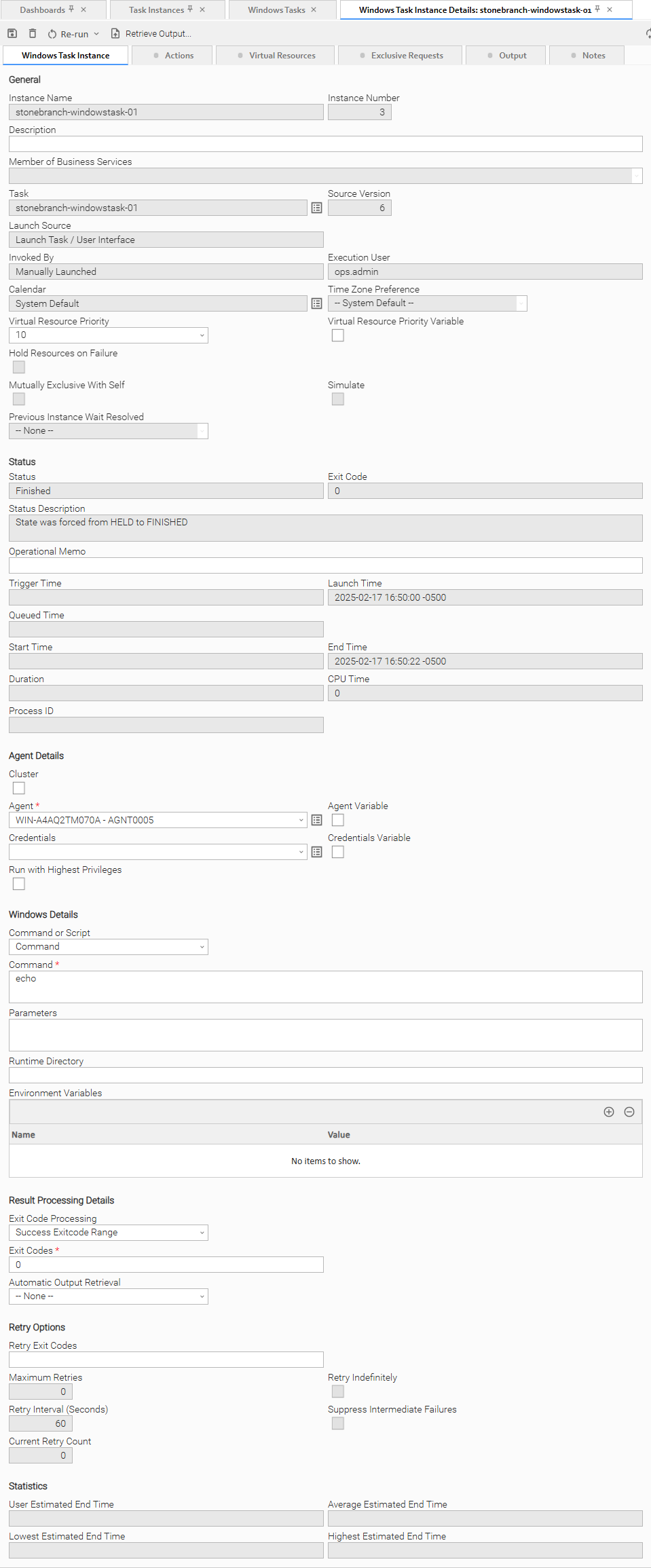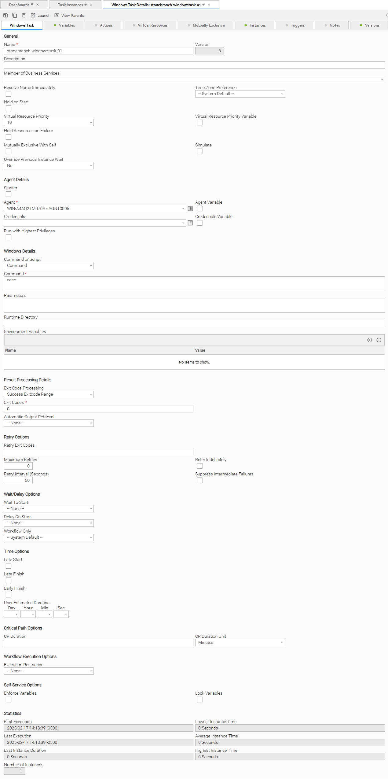 The following Windows Task Instance Details contains information on the execution of the task shown in the Windows Task Details.