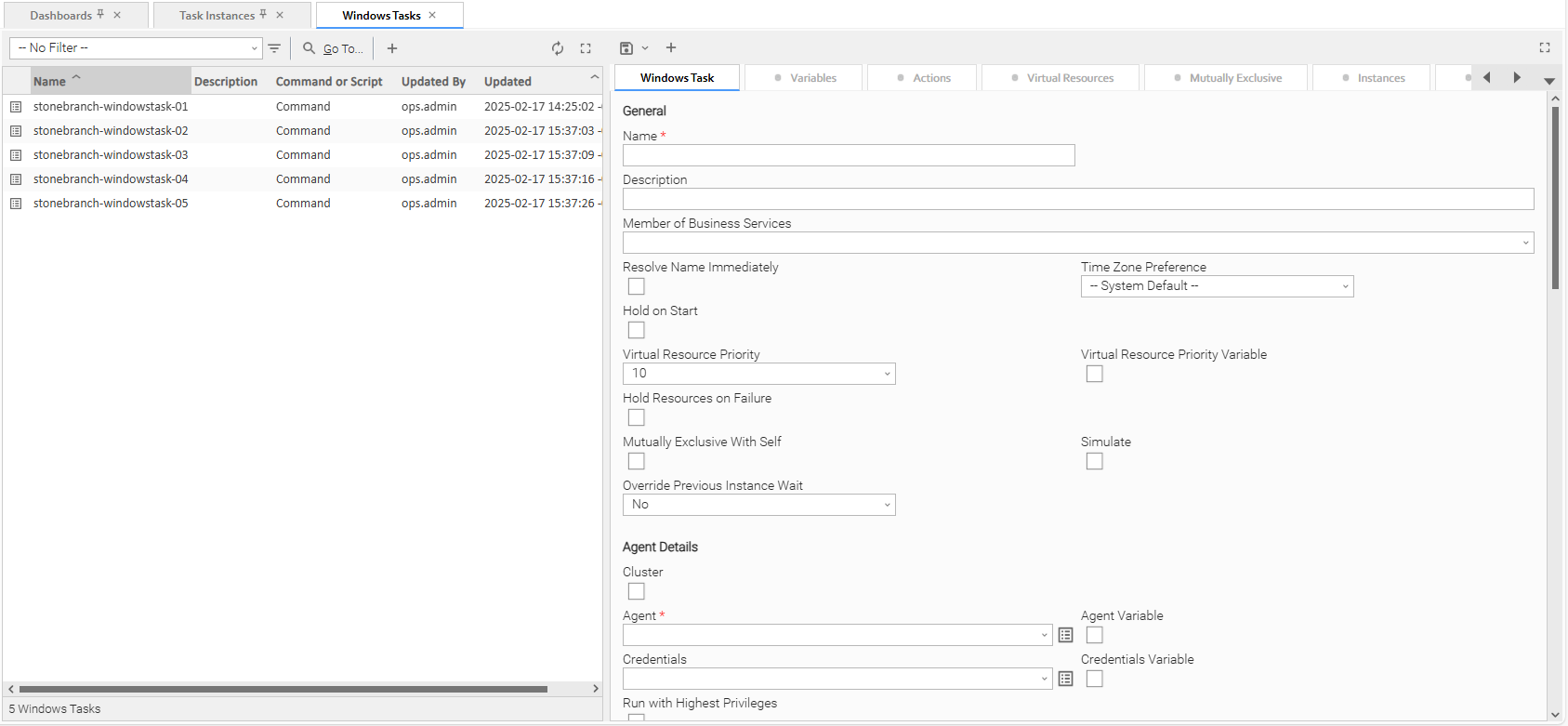 Credentials | Credentials under which an Agent runs this task. These Credentials override any Credentials provided in the Agent Details for any Agent running this task. If the user does not have a login shell, add a - character in front of the runtime credentials name. The Controller will provide a shell for that user and strip the - character from the name. Required if the Agent Credentials Required Universal Controller system property is true. When required, if the Credential is specified as a variable, and the variable resolves to blank, a Start Failure will occur. |