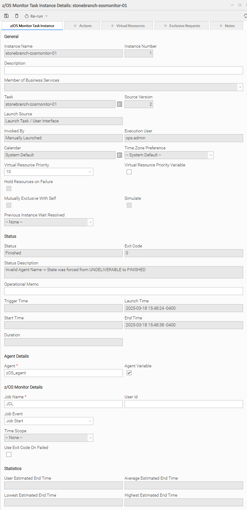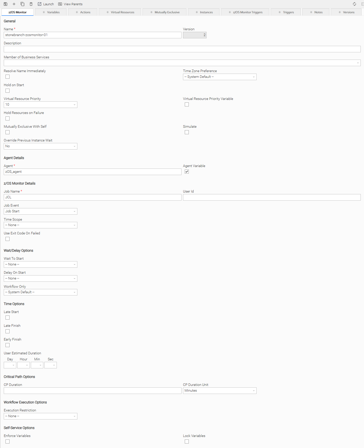 Time Scope | Allows monitoring of z/OS Jobs that were run prior to the z/OS Monitor task running, or limits how long the z/OS Monitor task continues to monitor before becoming Failed or Finished, Options: