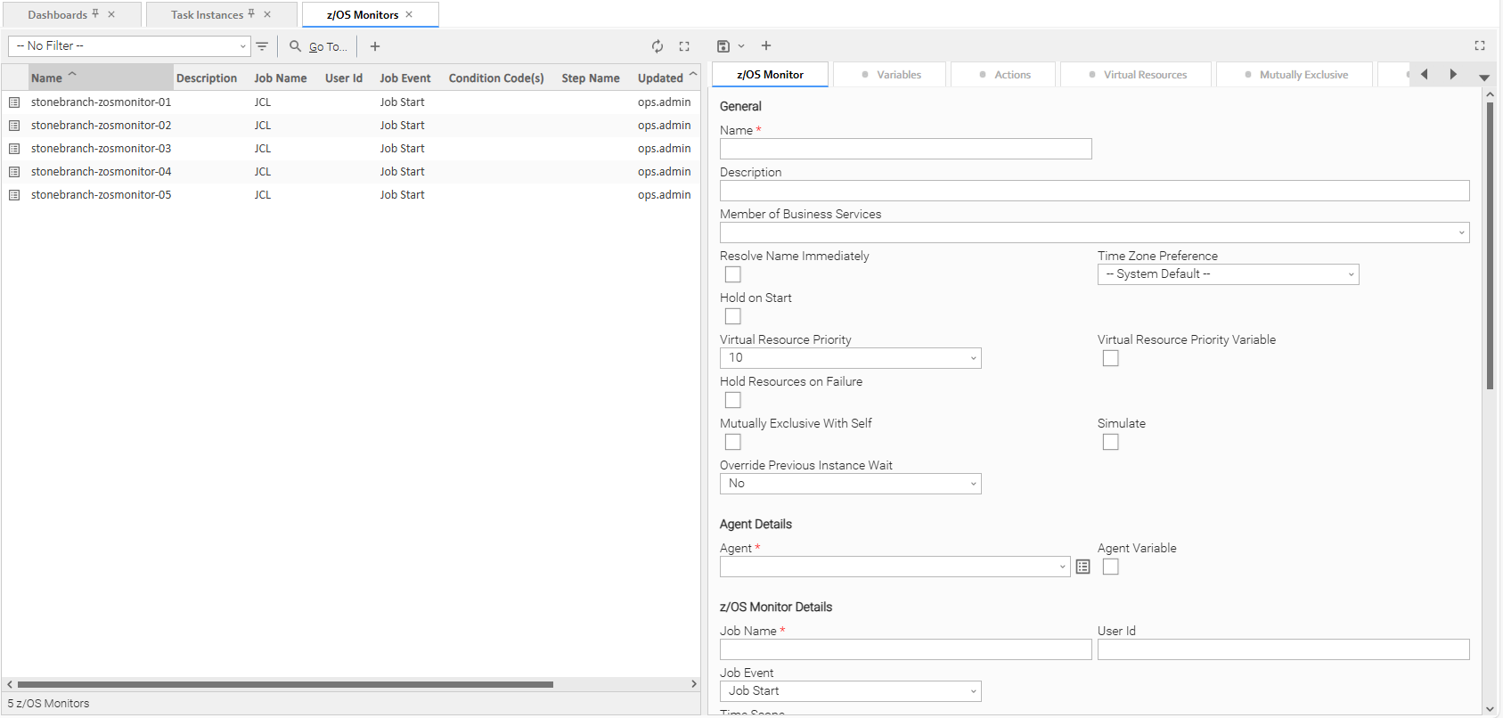 Step 1 | From the Automation Center navigation pane, select z/OS Monitors. The z/OS Monitor Tasks list displays a list of all currently defined z/OS Monitor tasks. To the right of the list, z/OS Monitor Task Details for a new z/OS Monitor task displays.