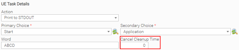 - Navigate to the "ue-task-test" task instance form, and ensure the Cancel Cleanup Time field is set to 0 as shown: