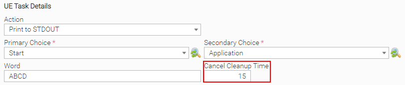 - Navigate to the "ue-task-test" task instance form, and ensure the Cancel Cleanup Time field is set to 15 as shown: