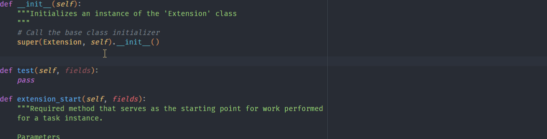 In the previous page, the code completion menu when accessing the fields within extension_start showed all the fields as expected.