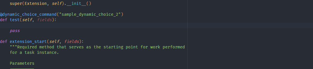 Shown below is the code completion menu when using the dynamic_choice_command decorator: