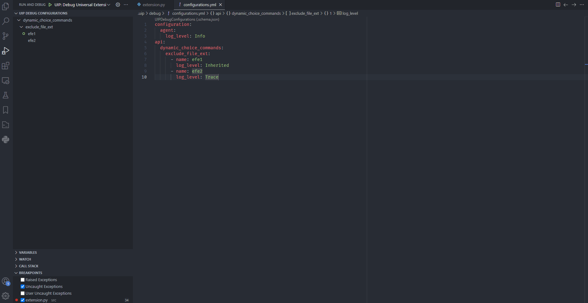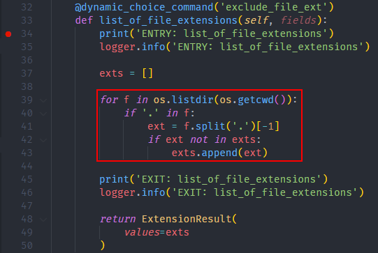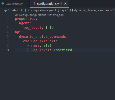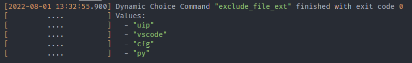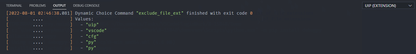 In the previous page, we debugged the exclude_file_ext dynamic choice command. You may have noticed the output in the UIP (EXTENSION) (can be opened with Shift+Alt+3) output channel contains py twice: