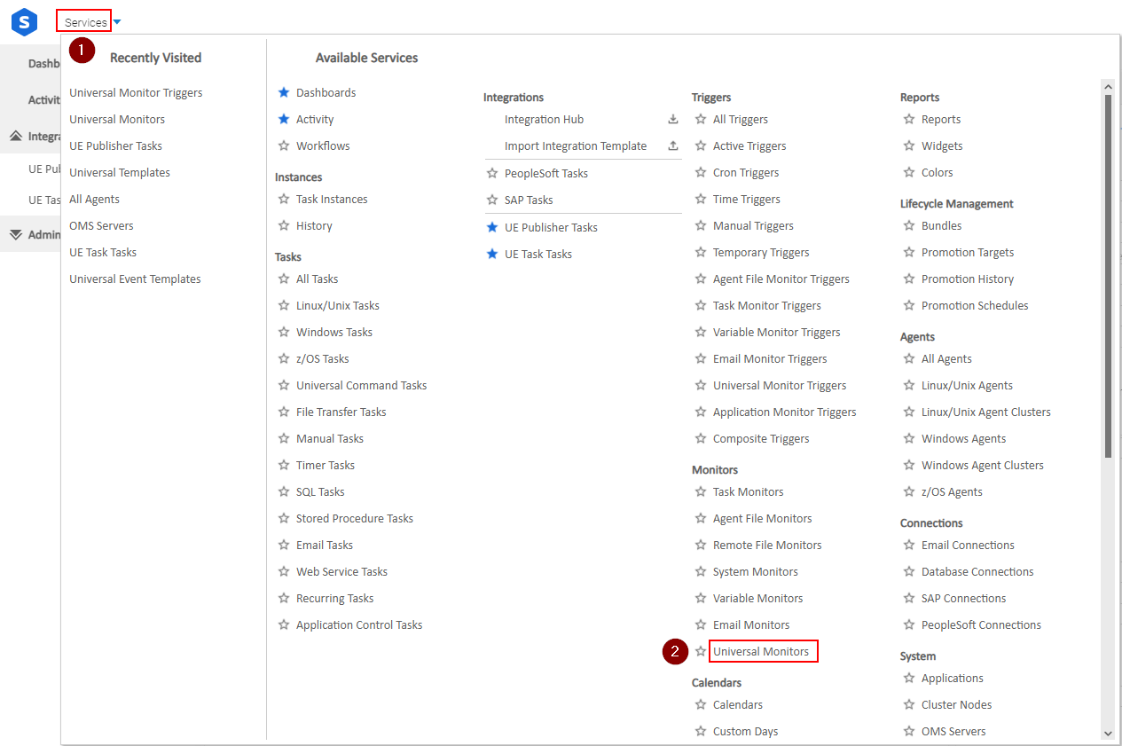 Under the Services menu, click Universal Monitors under the Monitors section as shown below:
