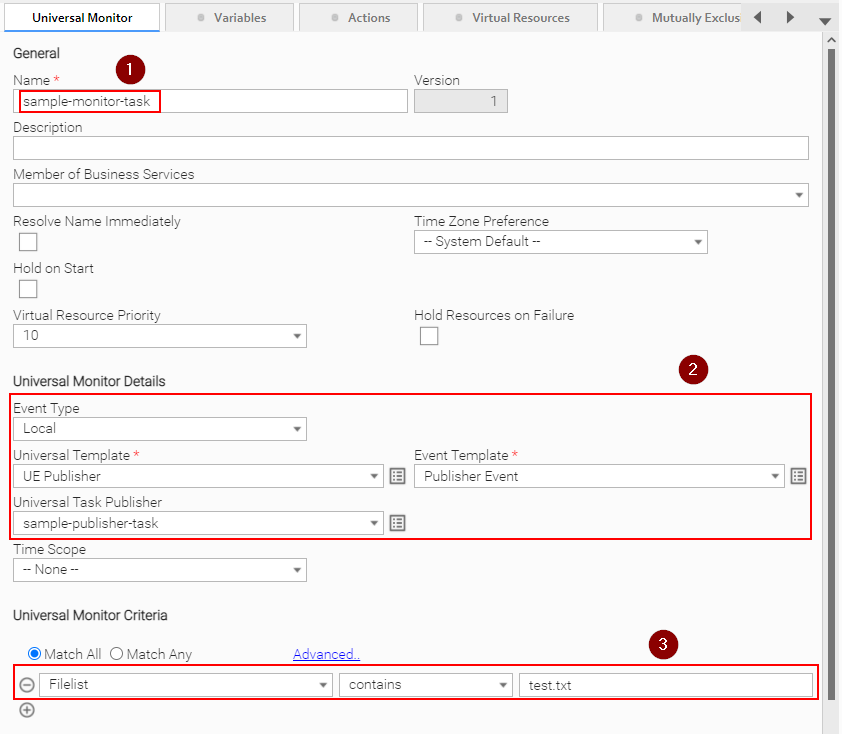 We can either run the sample-monitor-task as a standalone task which finishes upon detecting the target file (test.txt), or we can attach the task to a Universal Monitor trigger. To cover the complete functionality, we will attach it to a Universal Monitor Trigger.