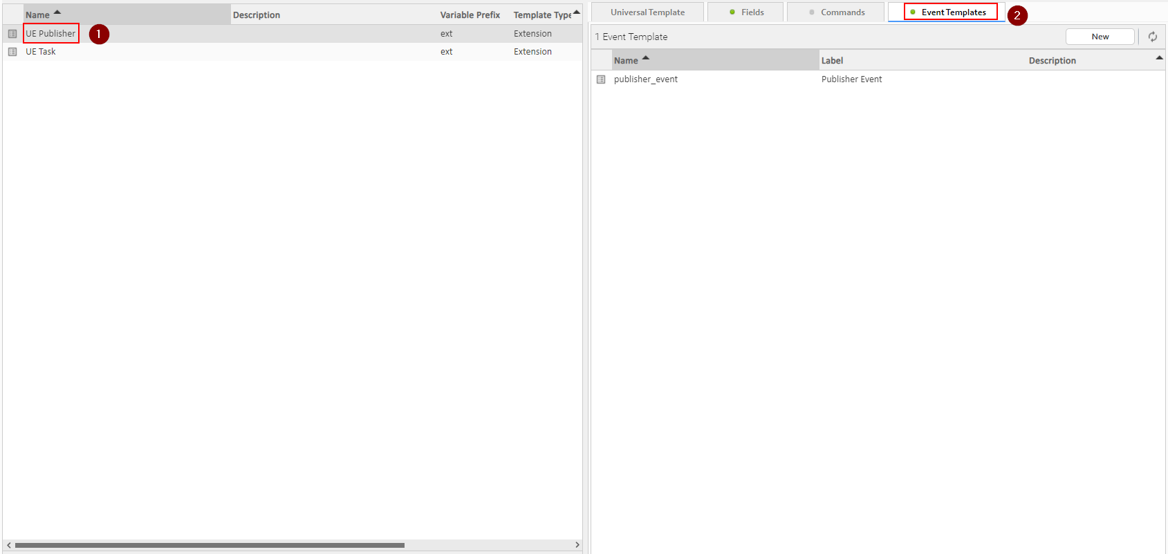 Navigate to the Event Templates tab of the UE Publisher template: