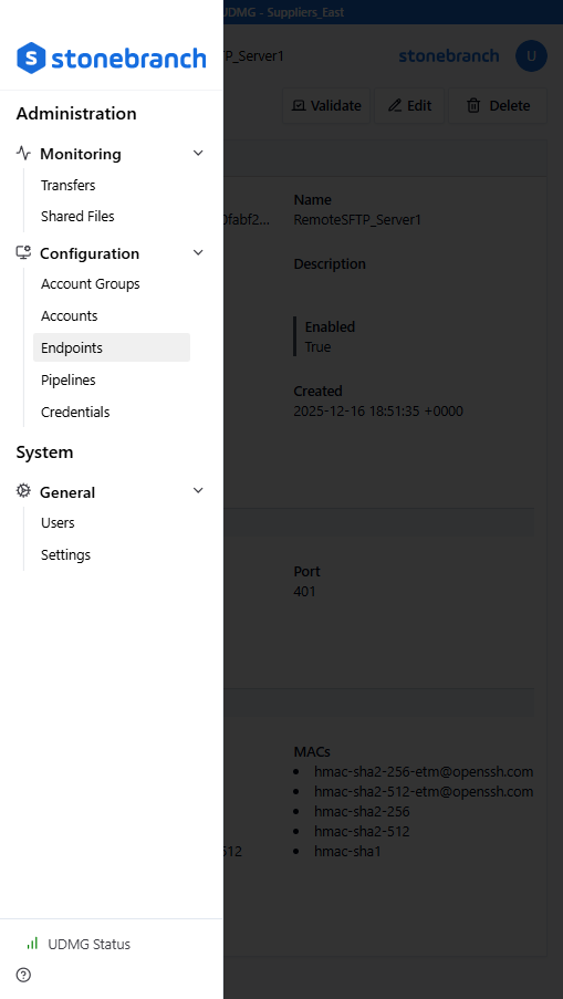 The Sidebar is the navigation pane on the left side of the UDMG Administrative User Interface (UI). You can access different areas of the UI by clicking the corresponding Sidebar label.